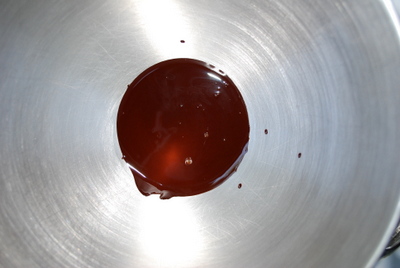 While the cake is baking we can start the frosting. Melt the butter in a sauce pan over low heat, add the cocoa. Stir constantly until it just comes to a boil.
